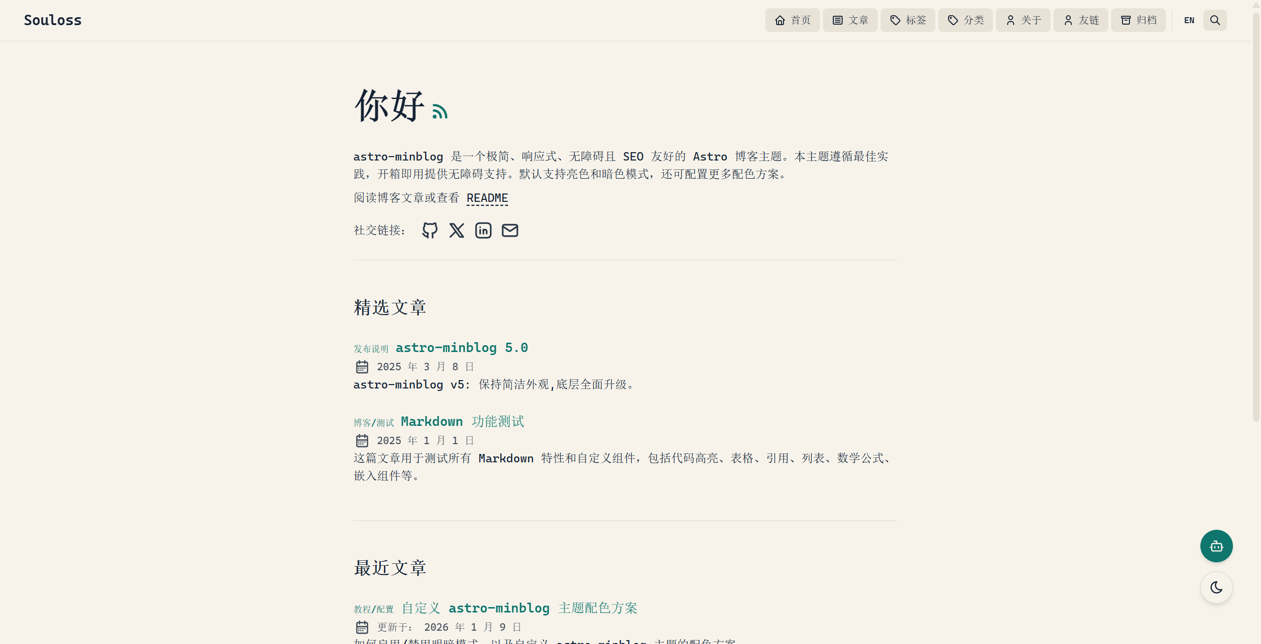 RSS Feedastro-minimax 是一个极简、响应式、无障碍且 SEO 友好的 Astro 博客主题。本主题遵循最佳实践,开箱即用提供无障碍支持。默认支持亮色和暗色模式,还可配置更多配色方案。